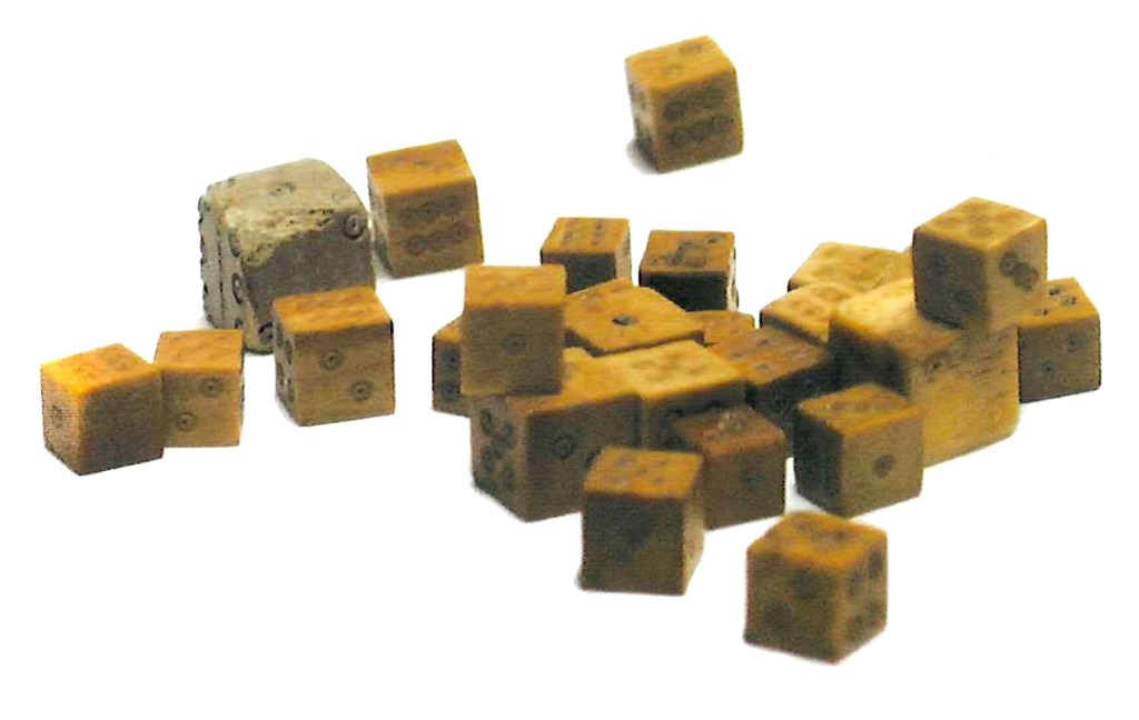 Dobbelspelen waren in de Middeleeuwen mateloos populair. Zelfs ondanks dat in vele steden gokken verboden was. Dobbelstenen zijn daarom geen unieke vondst. Bij de opgravingen op De Hof zijn in een voormalige drenkkuil maar liefst 39 dobbelstenen gevonden. Ze dateren alle uit ongeveer 1375. Twee van deze dobbelstenen zijn zeker gebruikt om vals mee te spelen. De een had een dubbele 3, maar geen 4. De andere had een dubbele 4, maar geen 5. Beide vertonen ook geen sporen van slijtage. Een duidelijke aanwijzing dat deze valse dobbelstenen niet vaak werden gebruikt. Ze werden door de valsspeler in zijn handpalm verborgen om op het juiste moment te kunnen verwisselen met de echte. Hoeveel mensen zullen er in zijn gestonken?
