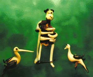 Raadselachtige voorwerpjes zijn het, deze minuscule glazen figuurtjes. Het kleine poppetje van bruin-wit glas stelt magere Hein voor, met zijn zeis aan zijn voeten. De andere figuurtjes zijn rozetjes, ooievaartjes, zwaantjes, een eendenkopje en een strikje, allemaal van wit of bruin-wit glas. Magere Hein is met zijn 2 cm de grootste; de rest is nog geen centimeter. Een precieze datering is lastig, maar waarschijnlijk gaat het hier om de 18de eeuw. Toen werd het gebruik van bruin glas hier namelijk gangbaar.