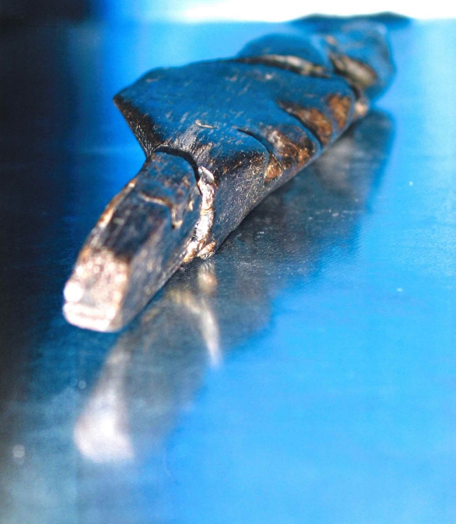 De schaats is gemaakt van wilgenhout en dateert van rond 1425. Aan de onderkant zie je een groef waar een glij-ijzer in heeft gezeten. Door een paar openingen aan de zijkant liepen de touwtjes of veters om ze vast te maken.