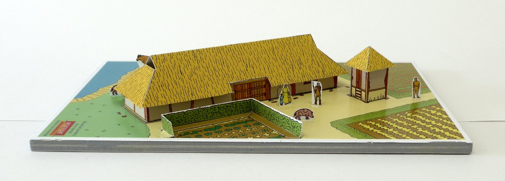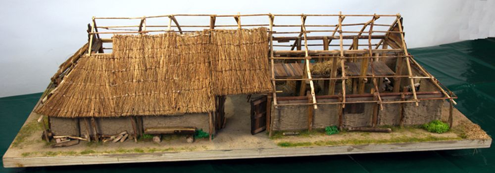 Replica van een boerderij uit de Late IJzertijd (250 v. Chr. tot begin van onze jaartelling). De boerderij zelf vinden we natuurlijk niet meer terug, maar wel de bijbehorende paalkuilen, greppels en scherven. En dat helpt bij de reconstructie.
