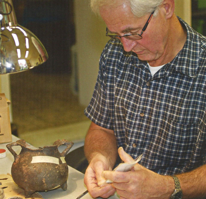 Jos Wielders is vrijwilliger en van huis uit klinisch chemicus. Hij heeft ook in de farmacie gewerkt. De oude apothekerspot (albarello) in de expo-ruimte van het CAR sprak hem daarom sterk aan. Met zijn onderzoekende geest, kennis van de farmaceutische wereld en interesse in geschiedenis is hij aan de slag gegaan. Het heeft geresulteerd in een artikel in de Kroniek van december 2020. Dat schrijven gaf hem veel voldoening, net als het maken van replica’s van een opgegraven spaarvarken. Bij het CAR heeft Jos het tekenen van vondsten overgenomen van een oud-collega. Zelfs in het digitale tijdperk worden vondsten nog vaak met tekening van aanzicht en doorsnede vastgelegd. Verder wil hij zich toeleggen op het restaureren van objecten, samen met een paar andere vrijwilligers.