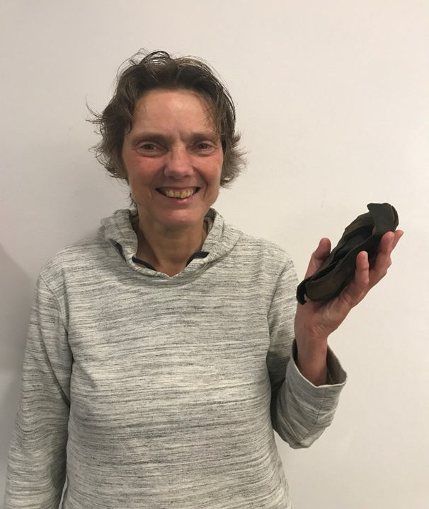 Carolien van der Brugge is vrijwilliger en heeft zich gespecialiseerd in vondsten van leer. Leer is een vergankelijk materiaal. Zij zorgt ervoor dat het vakkundig geprepareerd en geconserveerd wordt en zodoende behouden blijft. In haar beginjaren heeft ze veel meegewerkt aan opgravingen. Van alle opgravingen die ze meegemaakt heeft, vindt ze vooral die van buitenhuis Kouwenhoven bijzonder, mede omdat het eenmalig was: Amersfoort kent immers niet veel buitenhuizen. Bij de opgraving van herberg ’t Valkje (Stovestraat/Valkestraat), met al zijn beerputten, werd een compleet paar schoenen gevonden, weliswaar versleten, maar wel een linker- en rechterschoen samen. Een enkele complete schoen wordt nog wel eens gevonden, maar een paar, dat gebeurt vrijwel nooit.