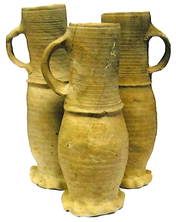 De bierkannen zijn gemaakt van hard aardewerk: steengoed. Deze bierkannen werden in de omgeving van Siegburg in het Duitse Rijnland gemaakt en binnen heel Europa verhandeld. Waarom Siegburg? Omdat daar de klei beschikbaar was waar steengoed van gemaakt kon worden. Tijdens zo’n jaarmarkt werden niet de mooiste bierkannen gebruikt. Integendeel: we hebben heel wat scheve, kromme of ‘platte’ bierkannen opgegraven. Zo konden de handelaren tijdens zo’n jaarmarkt toch nog de minder goed gelukte bierkannen verkopen.