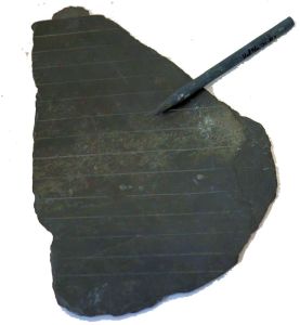 Een fragment van een schrijfleitje uit de 14de eeuw. Van oorsprong waren dit soort leitjes rechthoekig van vorm, met een houten rand eromheen. Je bestreek ze met was en schreef erin met een metalen stift. Door de was weer glad te strijken verdween de tekst en kon je het leitje opnieuw gebruiken of je tekst corrigeren cq aanpassen. Drukte je echter te hard op de stift, dan schreef je per ongeluk ook op het leitje zelf en bleef de tekst dus alsnog bewaard. Die teksten zijn overigens lang niet altijd leesbaar; er staan regelmatig verschillende teksten en tekeningen door elkaar heen, soms nauwelijks zichtbaar. Ook ons stukje lei is beschreven. En helaas is ook in dit geval de tekst heel moeilijk leesbaar.