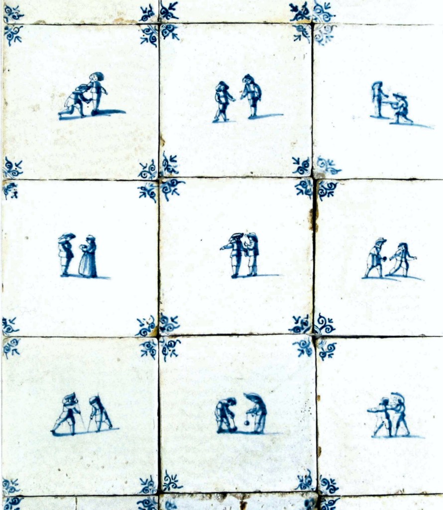 Tijdens de opgraving in 1978 op het terrein van het voormalige Observantenklooster zijn uit een 17de-eeuwse beerput onder andere een aantal Delftsblauwe wandtegeltjes met afbeeldingen van kinderspelen gevonden. Gelet op de hoekmotieven van onze tegels, de zogenaamde ‘ossenkoppen’, moeten ze vervaardigd zijn tussen 1625 en 1680. De tegels meten 12,2 bij 12,2 cm.