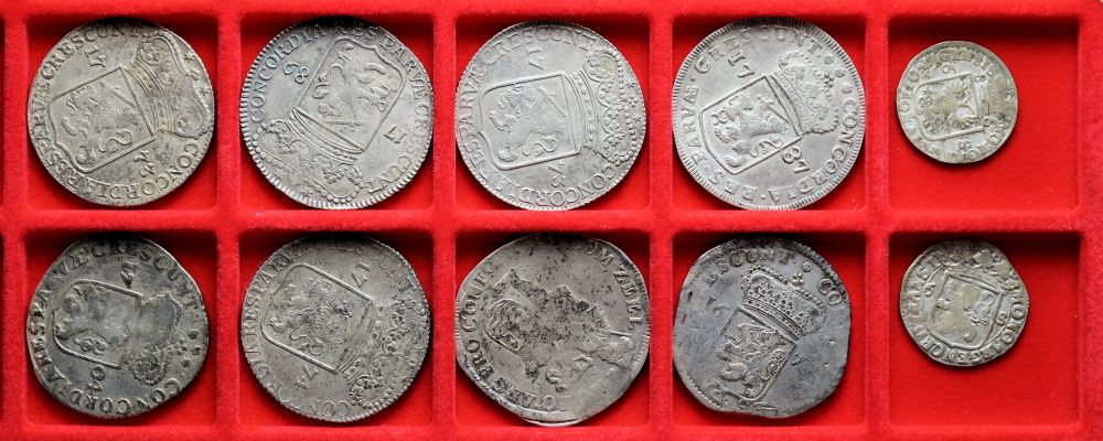 Tussen 2 muren, in een smalle ruimte van ca 40 cm, lagen 10 zilveren munten op een hoopje bij elkaar, zonder spoor van enige verpakking. Iemand heeft ze daar aan het eind van de 18de eeuw begraven, toen waarschijnlijk wél in een zakje, van leer of textiel. Dat zakje is in de loop van de tijd vergaan. Het zijn 2 statenschellingen (6-stuiverstukken) en 8 dukaten (rijksdaalders), allemaal van zilver. De jongste dateert uit 1789, de oudste uit 1659. Het kleinere geld was voor dagelijks gebruik. De dukaten waren dat zeker niet. Dat was handelsgeld.